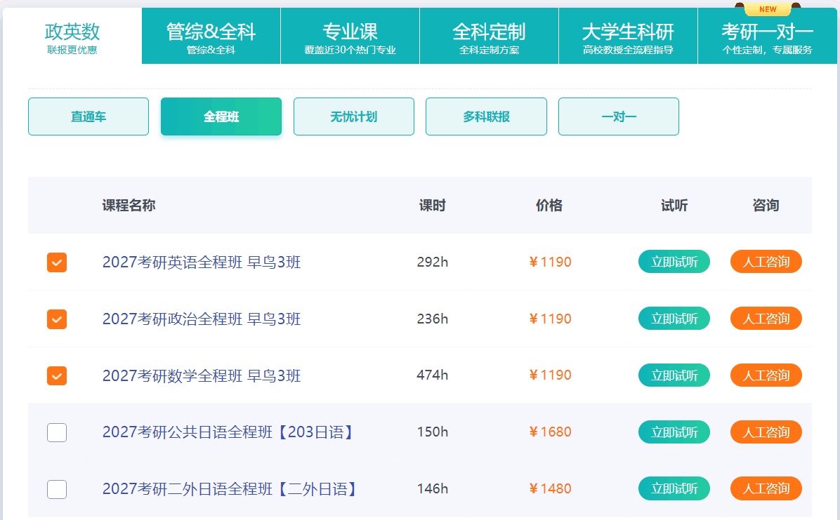 2027考研英语全程班:包含基础夯实、强化提升、冲刺预测三大阶段,配套讲义+真题库+模考训练;